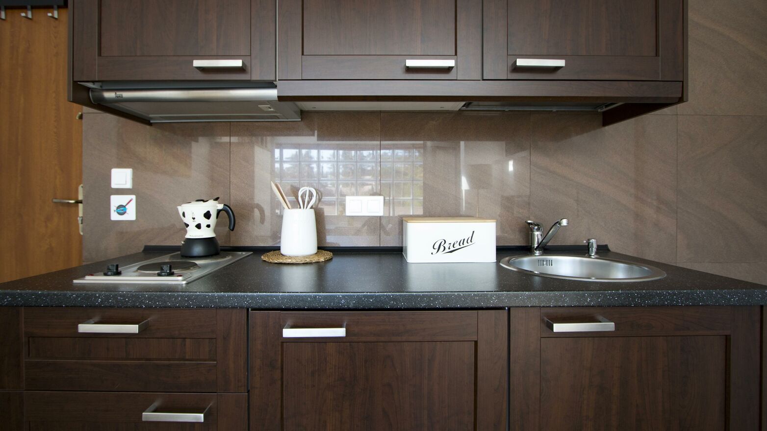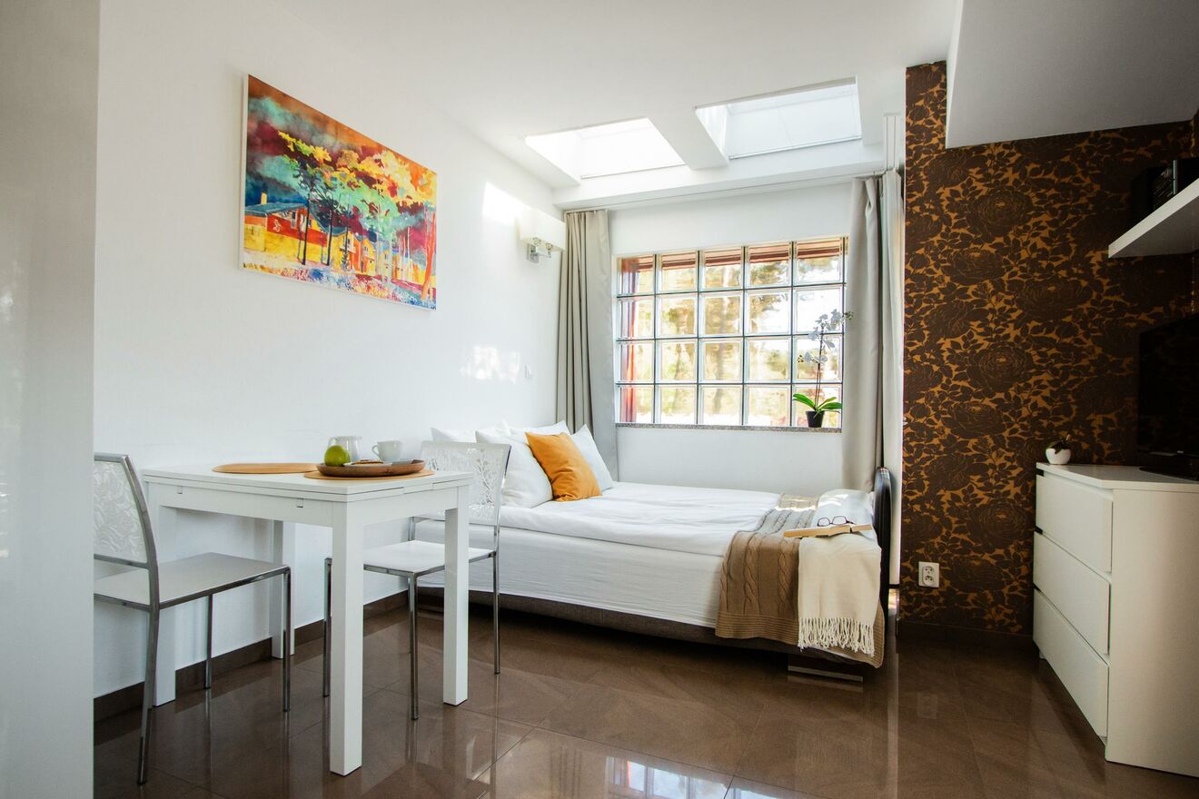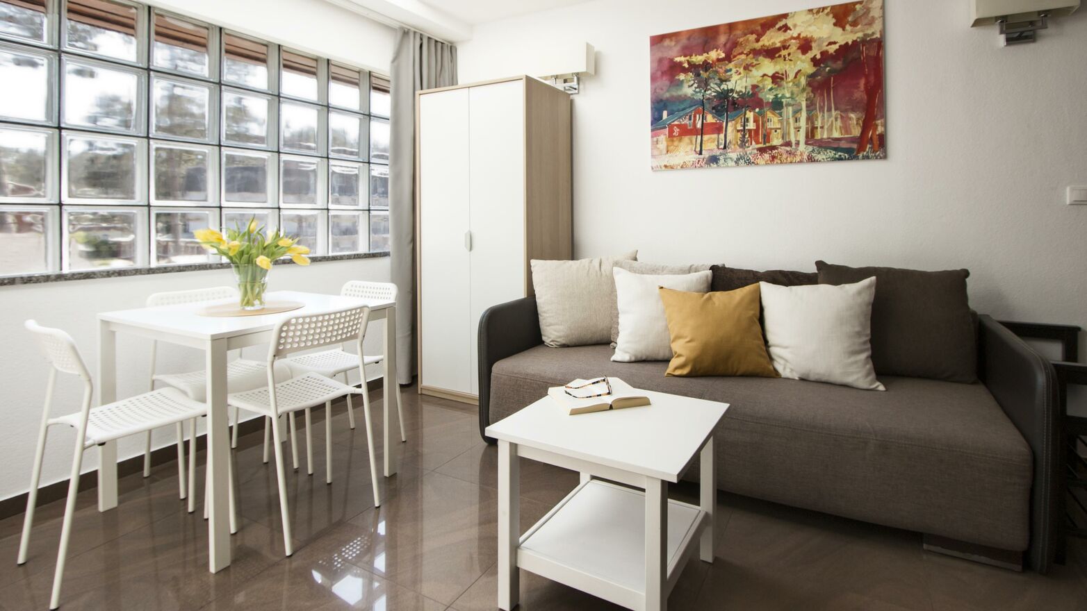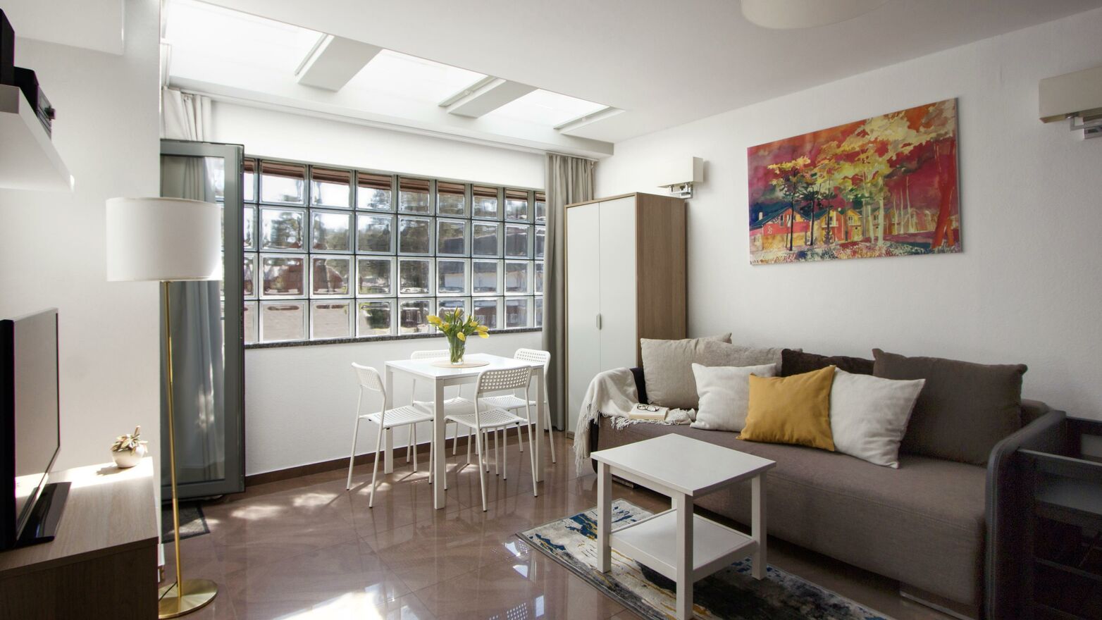 - 1 budynek z małą, nową stołówką i 2 pokojami typu studio ( jedno jednopokojowe z dużym balkonem, drugie studio na piętrze 2 pokojowe z balkonem.